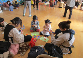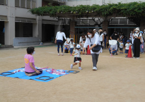 おうちの人と一緒にさかなつりごっこをしました。つりざおを使って、頑張ってつり上げたね。かけっこをして、タンブリンにタッチできて、楽しかったね。