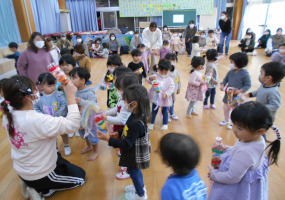 ペットボトルにみんなが持ってきたどんぐりを入れて、マラカスを作りました。飾りつけをして、「どんぐりころころ」の歌に合わせて、みんなでどんぐりマラカスを鳴らして、楽器遊びを楽しんだね。