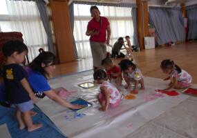 えのぐを手でぺたぺたして、楽しかったね!色が混ざっておもしろかったね。色水でジュースを作ったり、小さなプールで水遊びをしたりして思いきり遊んだね!